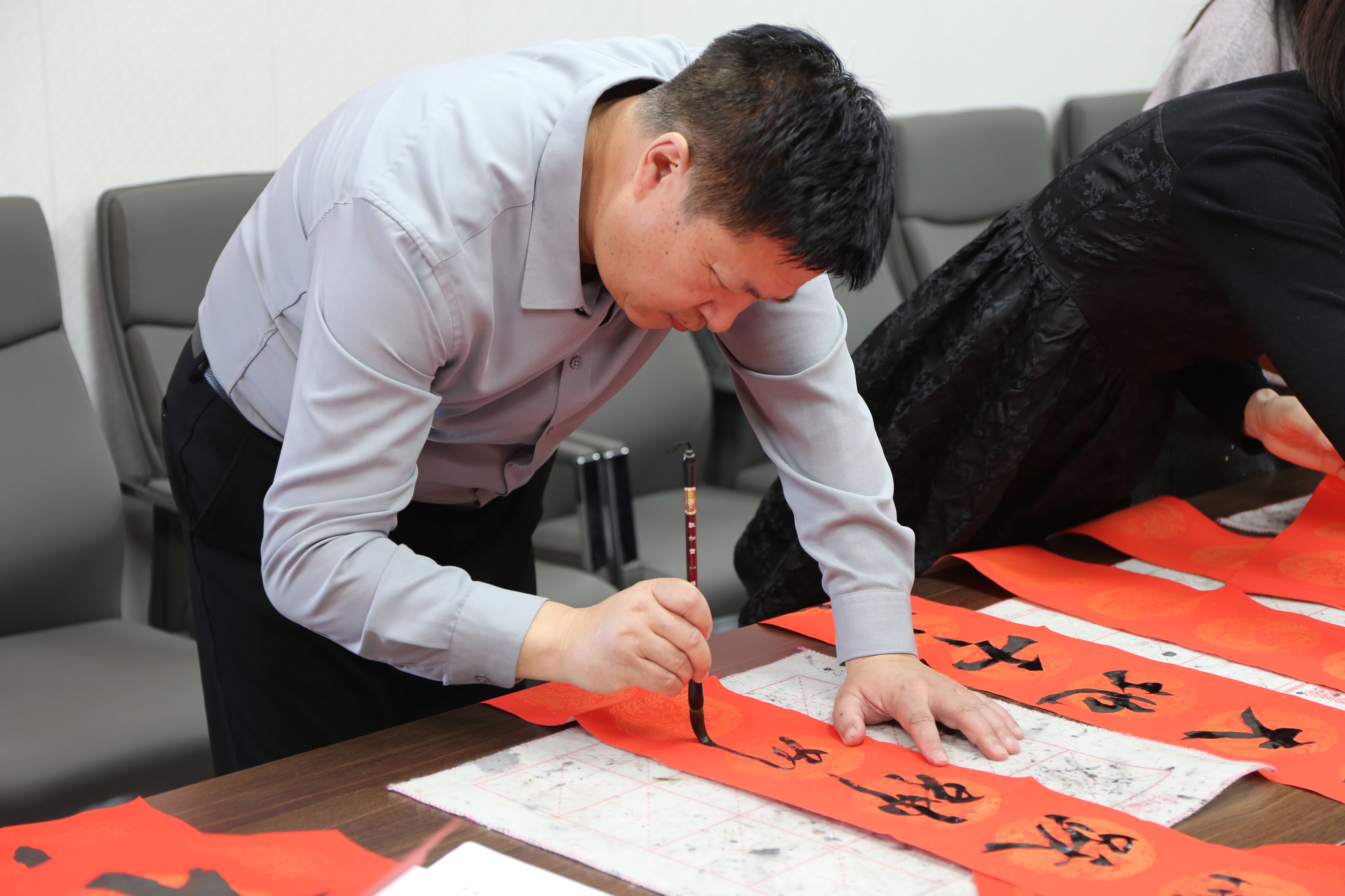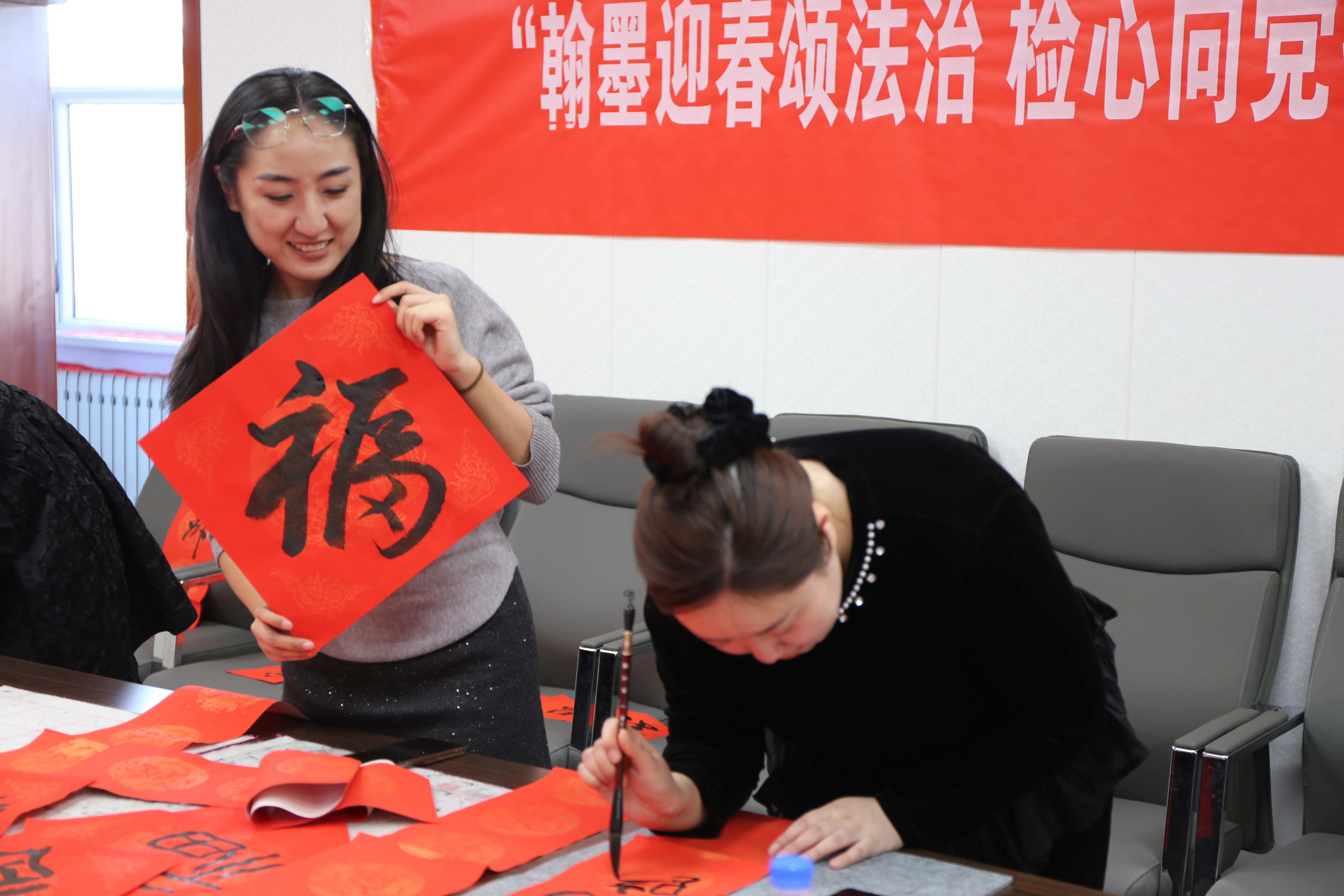 笔墨传情间,检民同心氛围浓厚。检察人员或围坐观摩、静心品鉴,或提笔研学、切磋技艺,在与书法名家的交流中感受汉字艺术的博大精深,在笔墨晕染中涵养廉洁从检的文化底蕴。部分检察人员结合检察履职经历,即兴创作“执法为民显担当,秉公司法守初心”等作品,将对检察事业的赤诚与对群众的深情凝于笔端。活动间隙,小心翼翼地将墨迹未干的春联、“福”字晾干整理。