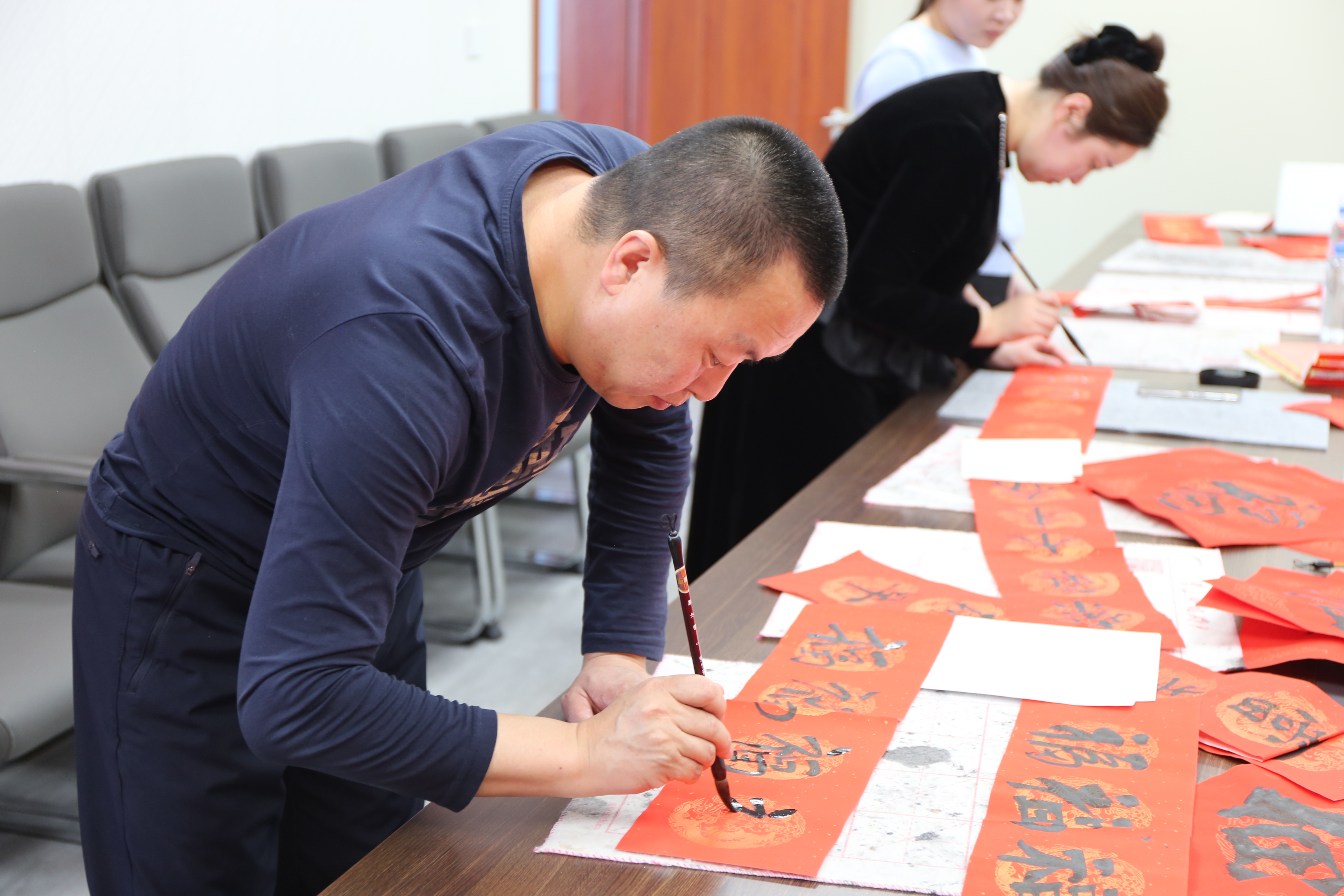 笔墨传情间,检民同心氛围浓厚。检察人员或围坐观摩、静心品鉴,或提笔研学、切磋技艺,在与书法名家的交流中感受汉字艺术的博大精深,在笔墨晕染中涵养廉洁从检的文化底蕴。部分检察人员结合检察履职经历,即兴创作“执法为民显担当,秉公司法守初心”等作品,将对检察事业的赤诚与对群众的深情凝于笔端。活动间隙,小心翼翼地将墨迹未干的春联、“福”字晾干整理。